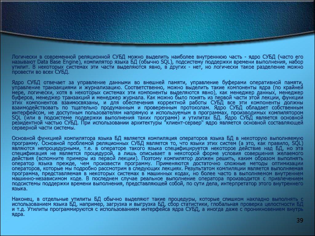 Логически в современной реляционной СУБД можно выделить наиболее внутреннюю часть - ядро СУБД (часто егоназывают Data Base Engine), компилятор языка БД (обычно SQL), подсистему поддержки времени выполнения, набор