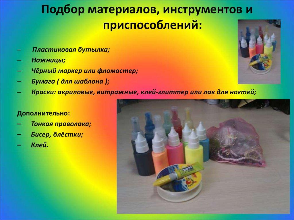 Краски: акриловые, витражные, клей-глиттер или лак для ногтей;