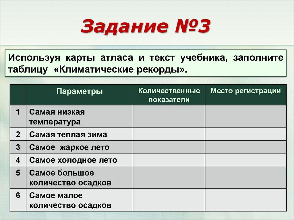 Задание №3Используя карты атласа и текст учебника, заполните