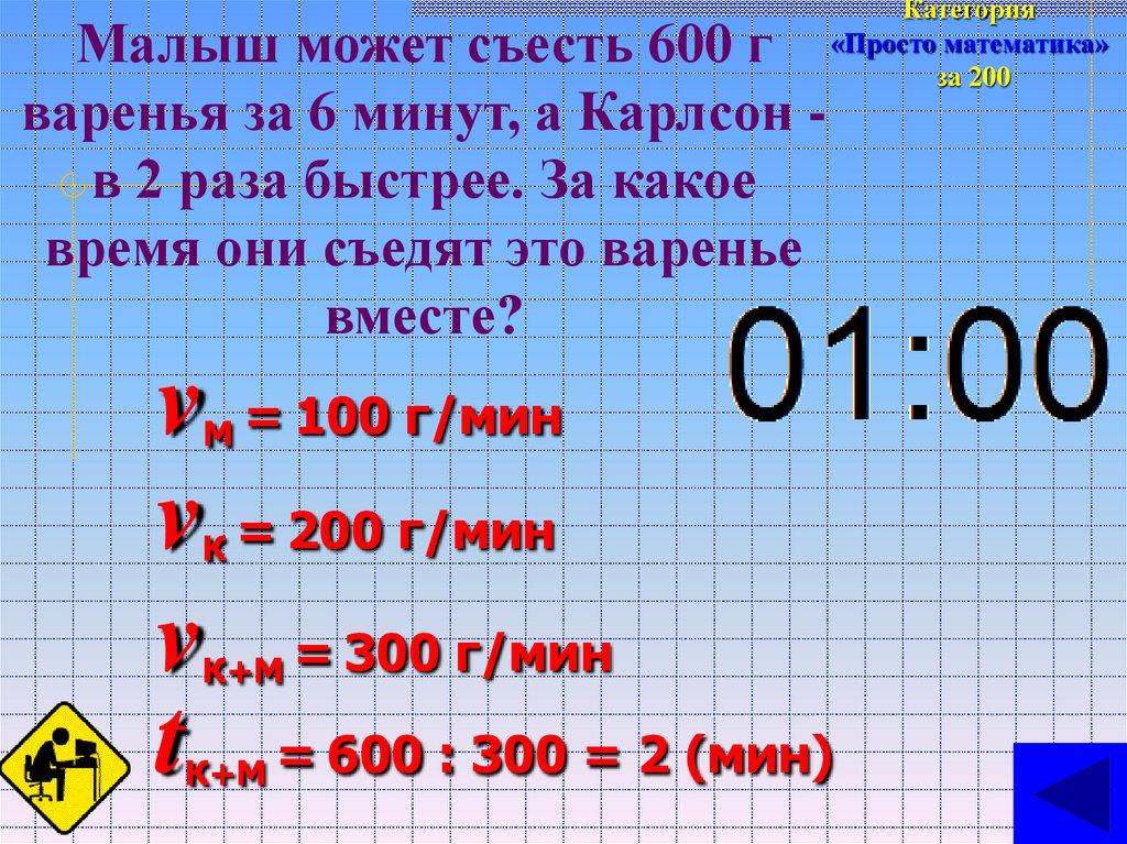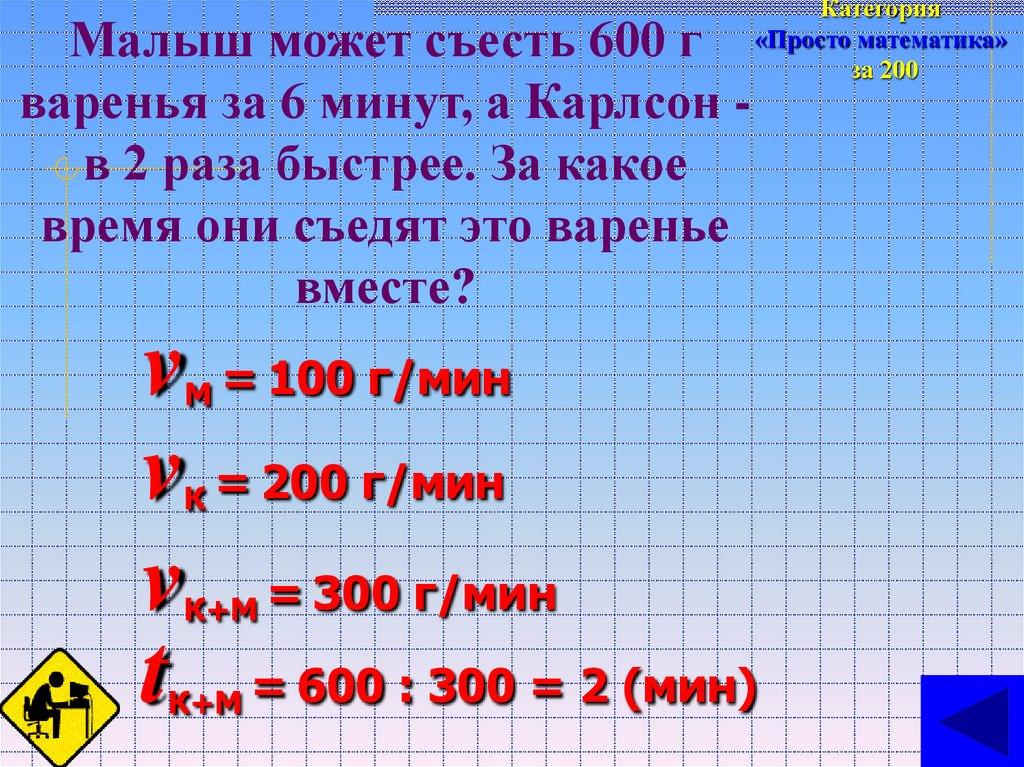 Малыш может съесть 600 гваренья за 6 минут, а Карлсон в 2 раза быстрее. За какое