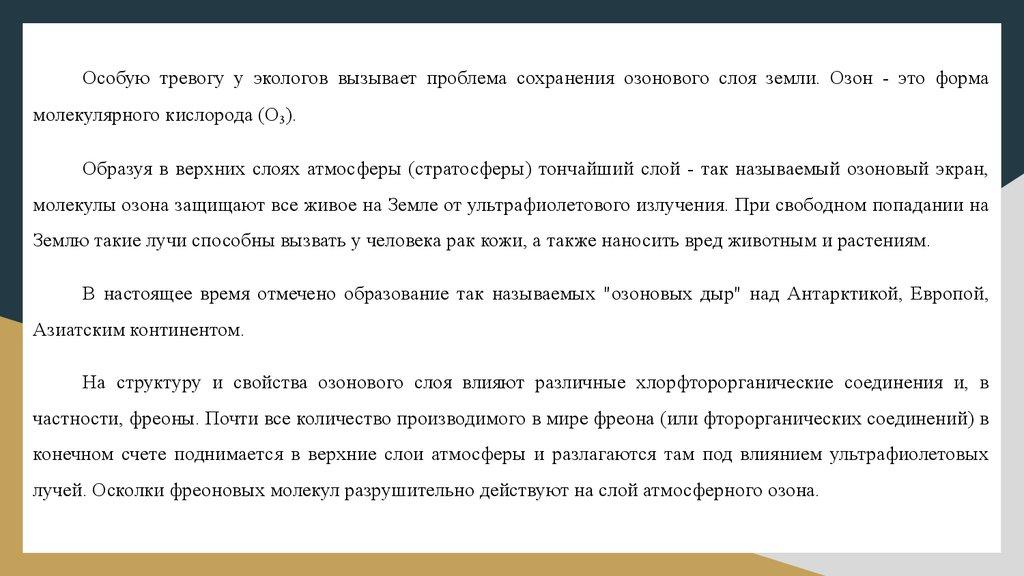 На структуру и свойства озонового слоя влияют различные хлорфторорганические соединения и, в