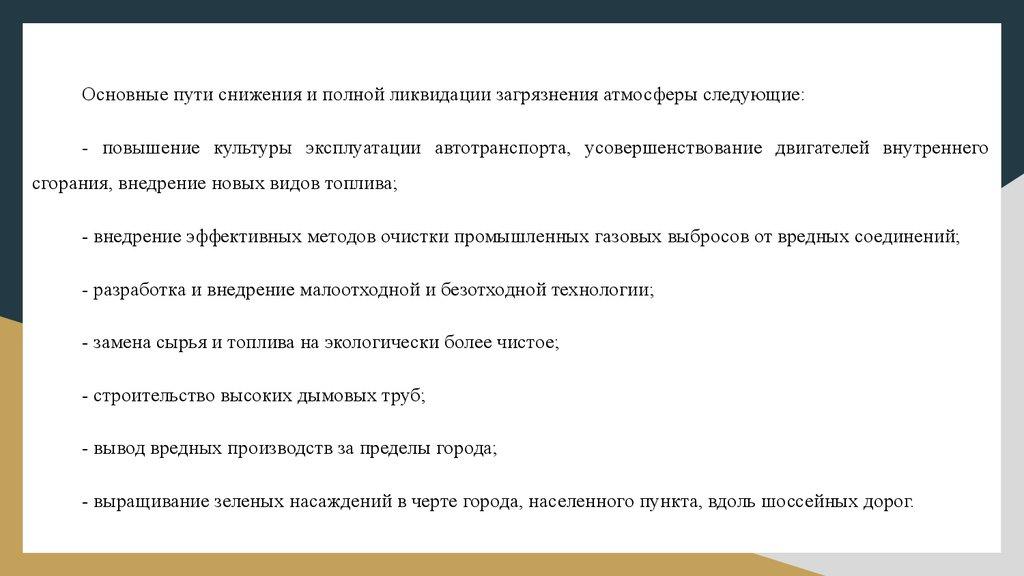 Основные пути снижения и полной ликвидации загрязнения атмосферы следующие:- повышение культуры эксплуатации автотранспорта, усовершенствование двигателей внутреннего