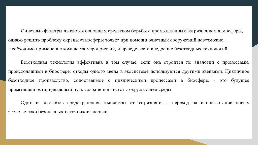 Очистные фильтры являются основным средством борьбы с промышленным загрязнением атмосферы,однако решить проблему охраны атмосферы только при помощи очистных сооружений невозможно.