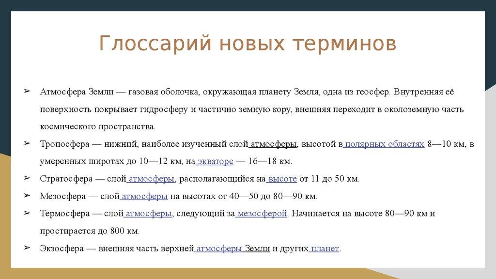 Глоссарий новых терминов➢ Атмосфера Земли — газовая оболочка, окружающая планету Земля, одна из геосфер. Внутренняя её