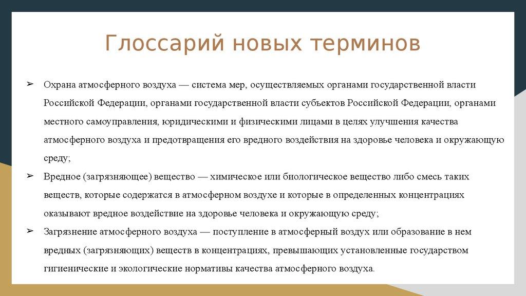 Глоссарий новых терминов➢ Охрана атмосферного воздуха — система мер, осуществляемых органами государственной власти
