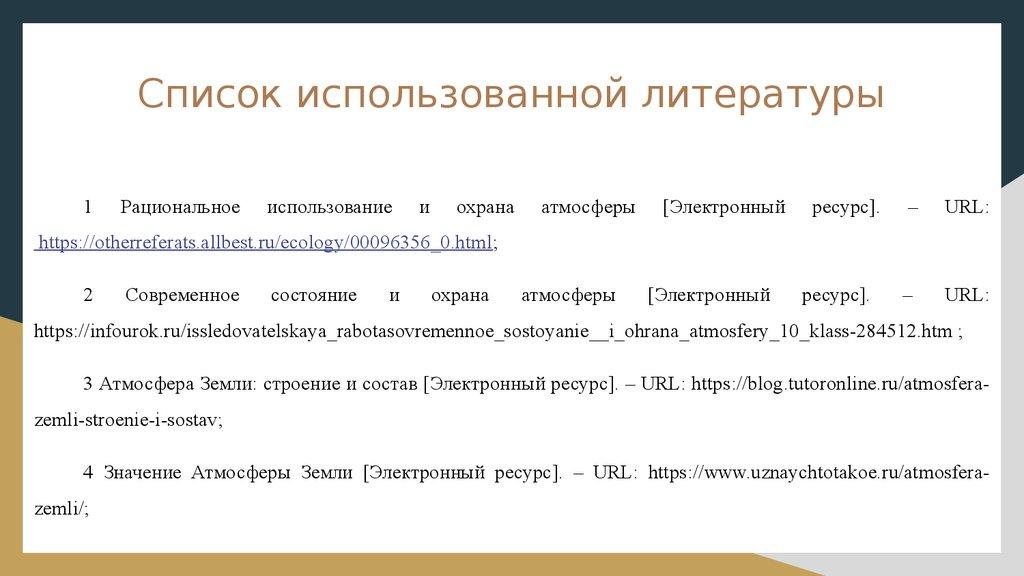 Список использованной литературы5 Современное состояние атмосферы [Электронный ресурс]. – URL: https://helpiks.org/8-40843.html;