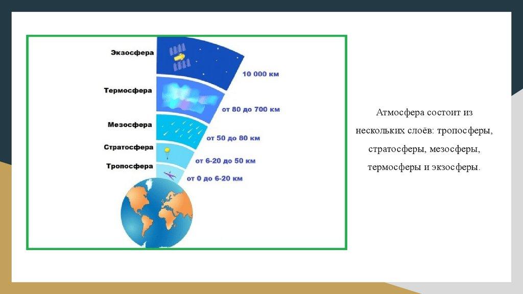 Атмосфера состоит изнескольких слоёв: тропосферы,