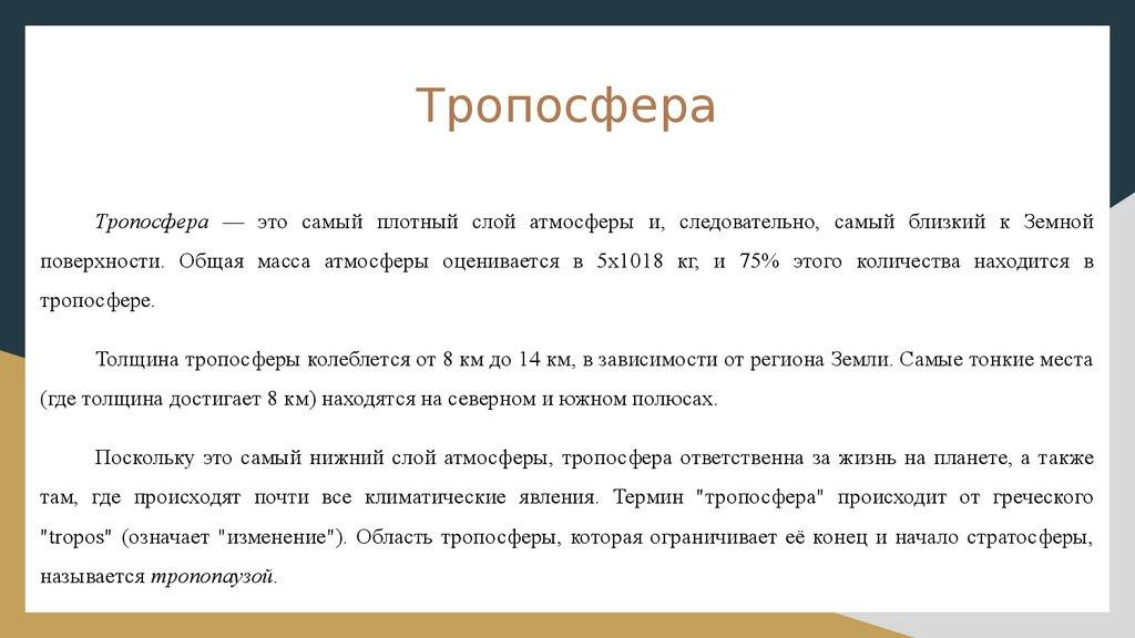ТропосфераТропосфера — это самый плотный слой атмосферы и, следовательно, самый близкий к Земной