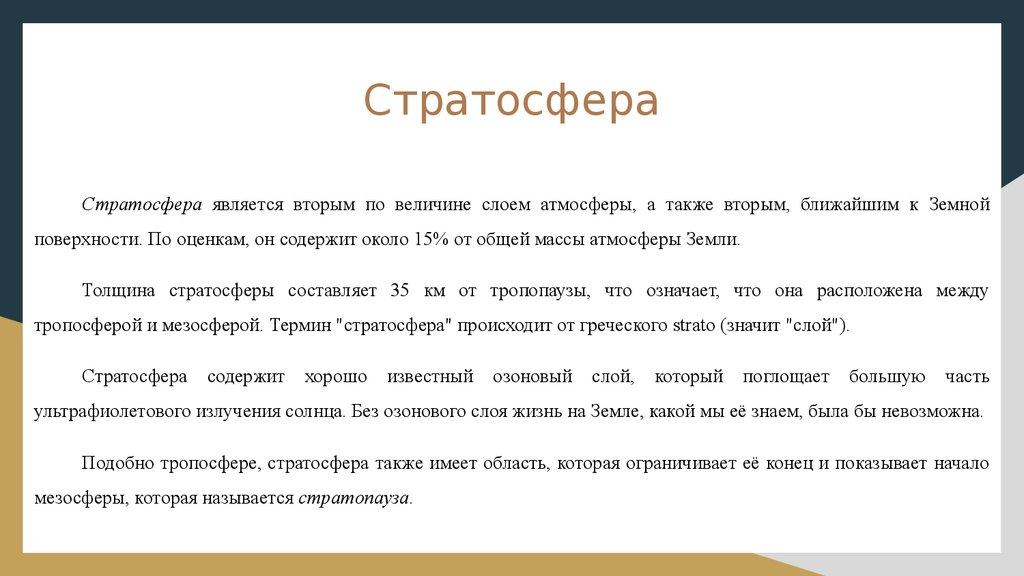 СтратосфераСтратосфера является вторым по величине слоем атмосферы, а также вторым, ближайшим к Земной