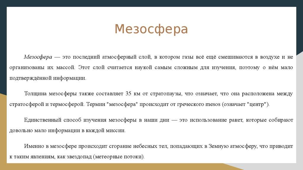 МезосфераМезосфера — это последний атмосферный слой, в котором газы всё ещё смешиваются в воздухе и не