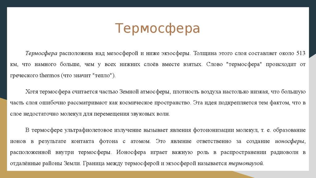 км, что намного больше, чем у всех нижних слоёв вместе взятых. Слово "термосфера" происходит от