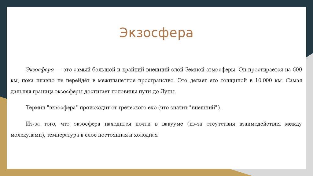 ЭкзосфераЭкзосфера — это самый большой и крайний внешний слой Земной атмосферы. Он простирается на 600