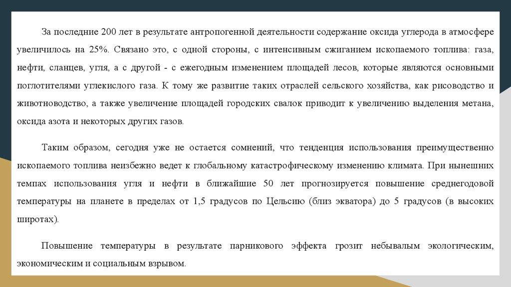 За последние 200 лет в результате антропогенной деятельности содержание оксида углерода в атмосфереувеличилось на 25%. Связано это, с одной стороны, с интенсивным сжиганием ископаемого топлива: газа,