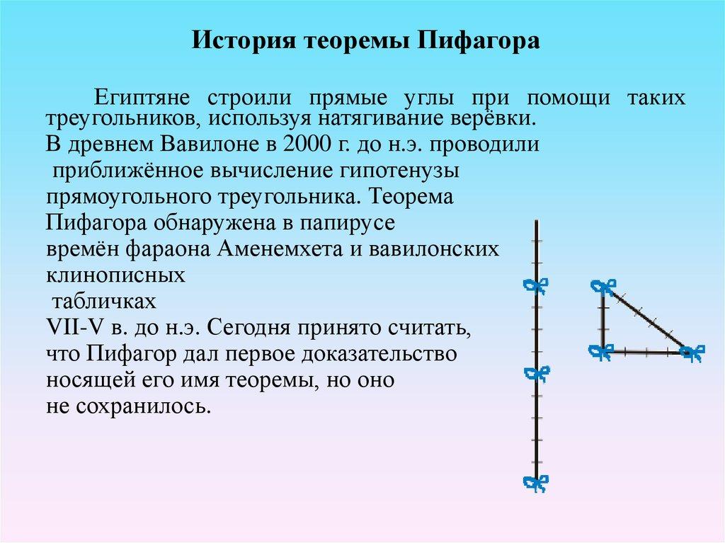 История теоремы ПифагораЕгиптяне строили прямые углы при помощи таких