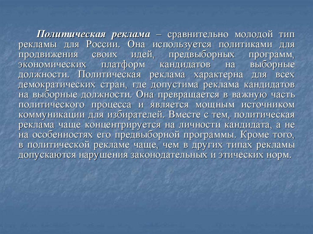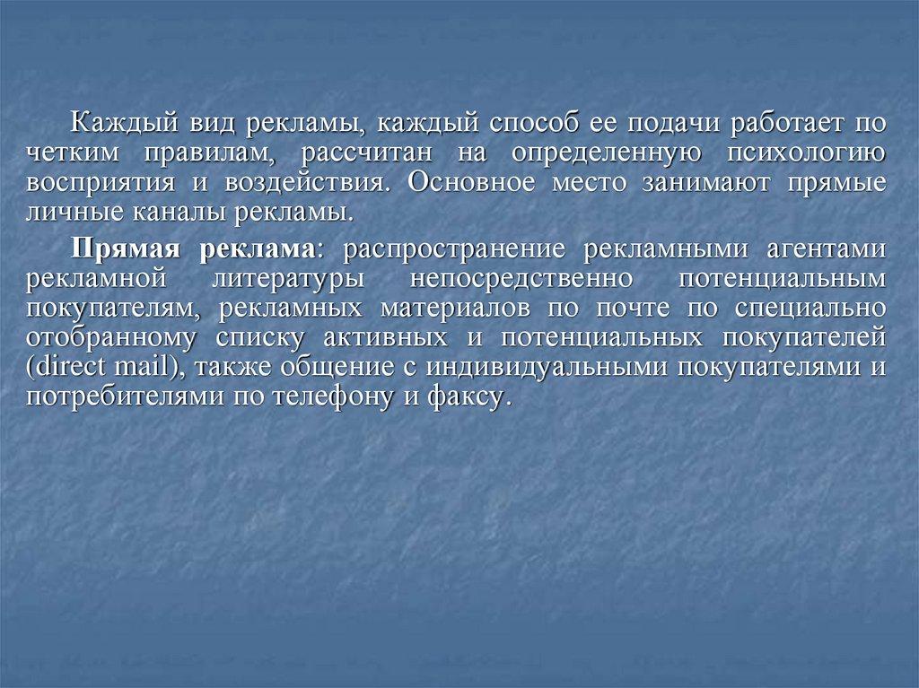 Каждый вид рекламы, каждый способ ее подачи работает почетким правилам, рассчитан на определенную психологию