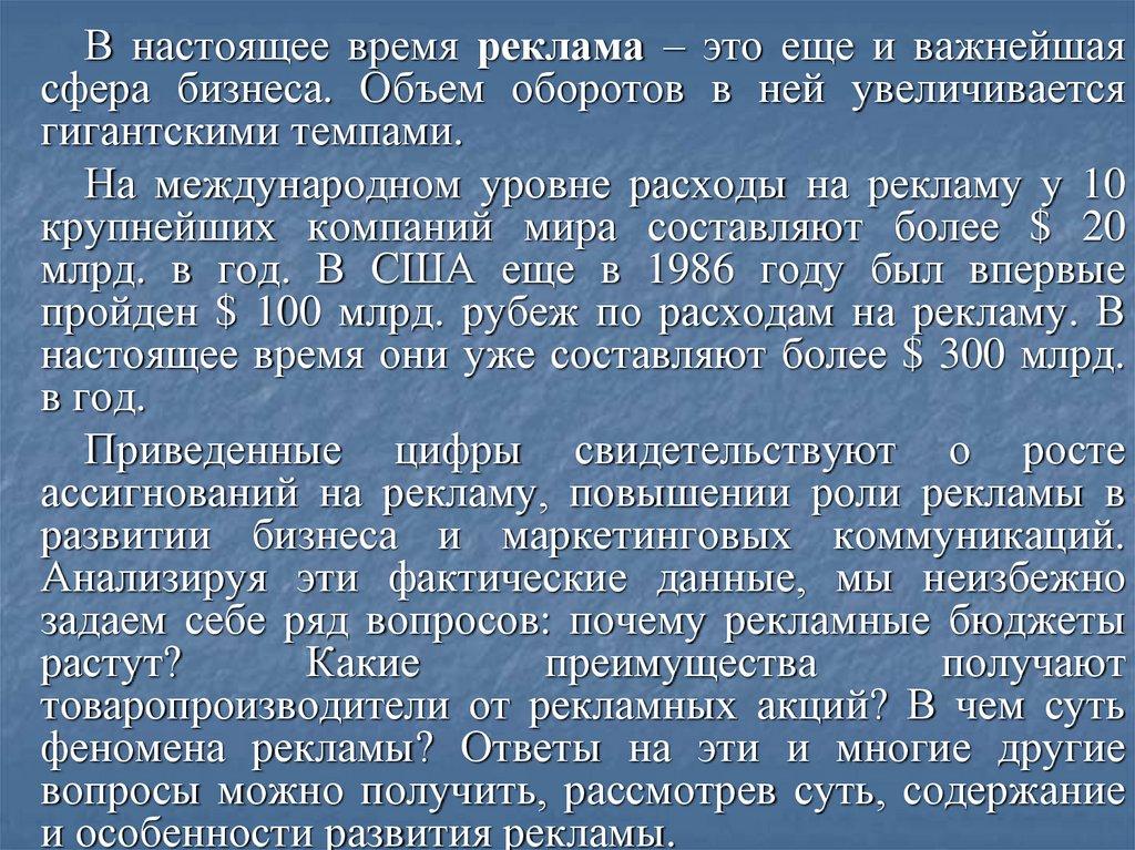 В настоящее время реклама – это еще и важнейшаясфера бизнеса. Объем оборотов в ней увеличивается