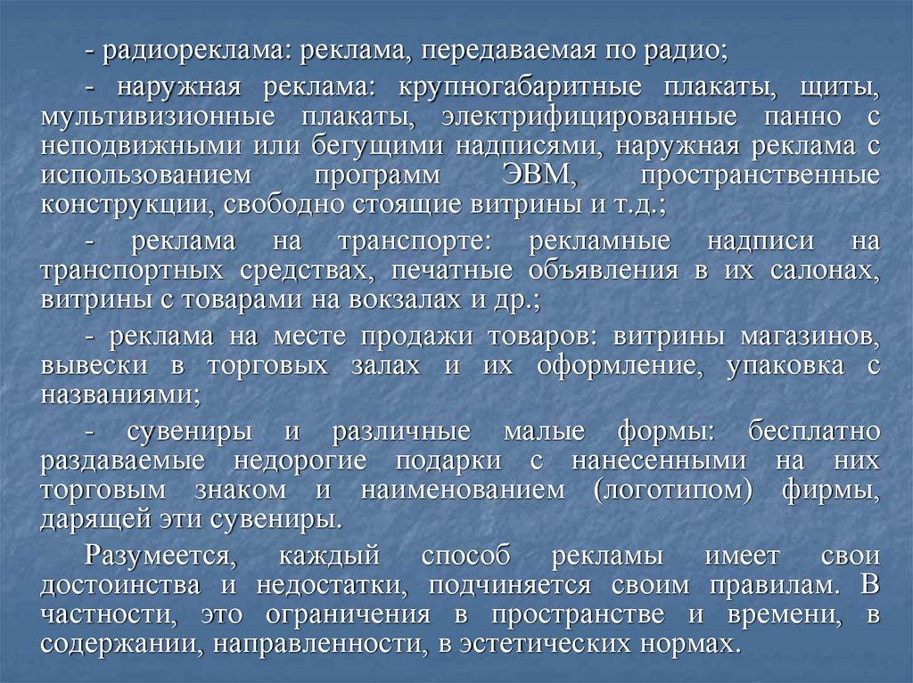 - радиореклама: реклама, передаваемая по радио;- наружная реклама: крупногабаритные плакаты, щиты,
