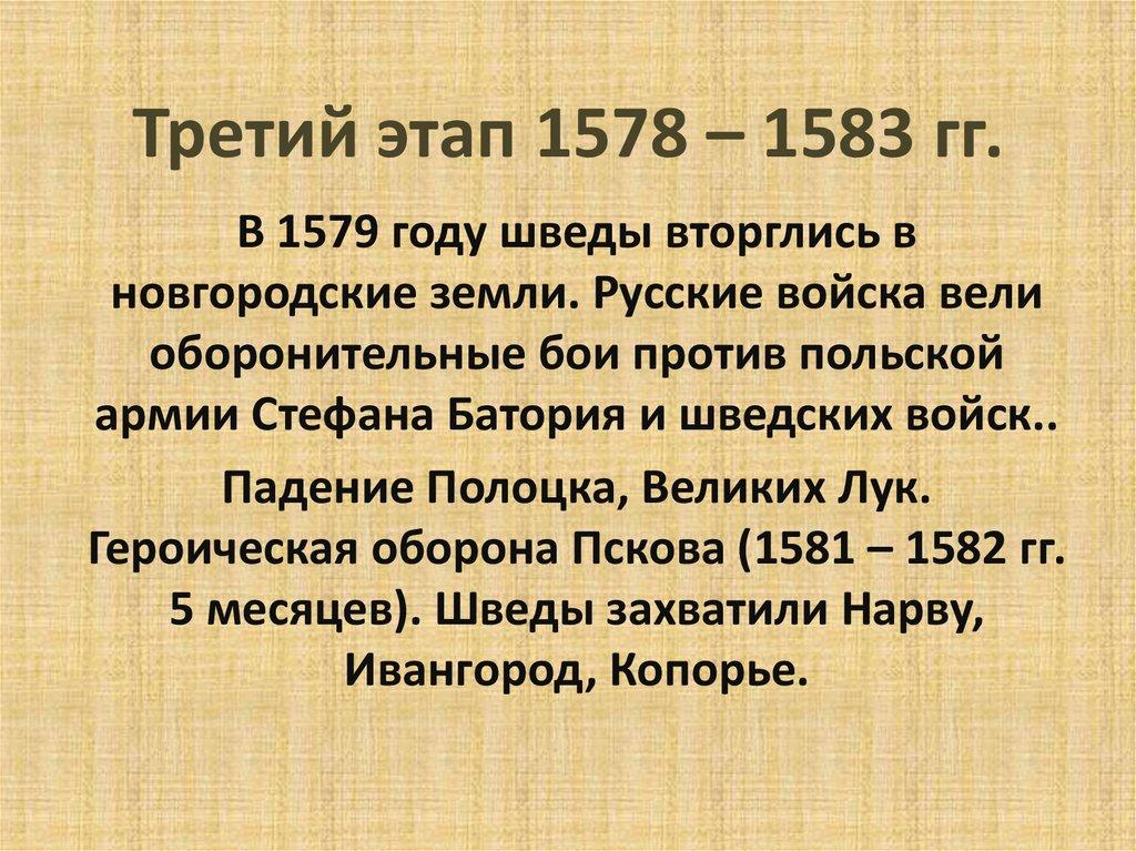 Третий этап 1578 – 1583 гг.В 1579 году шведы вторглись в