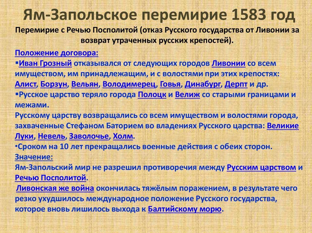 Ям-Запольское перемирие 1583 годПеремирие с Речью Посполитой (отказ Русского государства от Ливонии за
