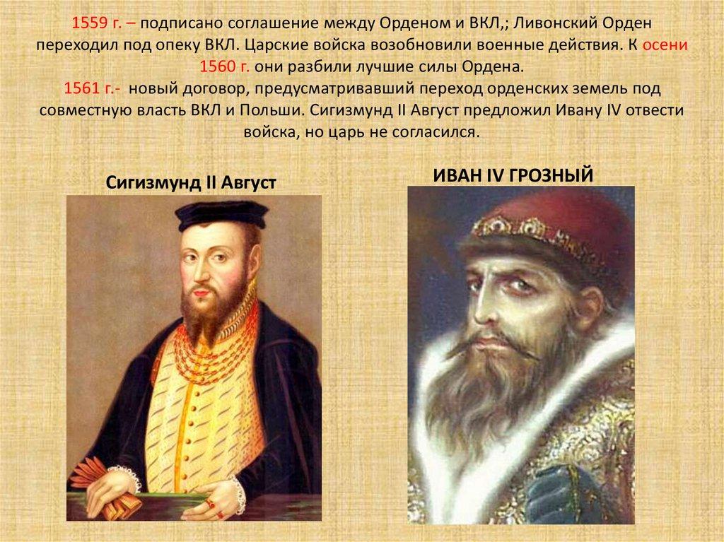 1559 г. – подписано соглашение между Орденом и ВКЛ,; Ливонский Орденпереходил под опеку ВКЛ. Царские войска возобновили военные действия. К осени