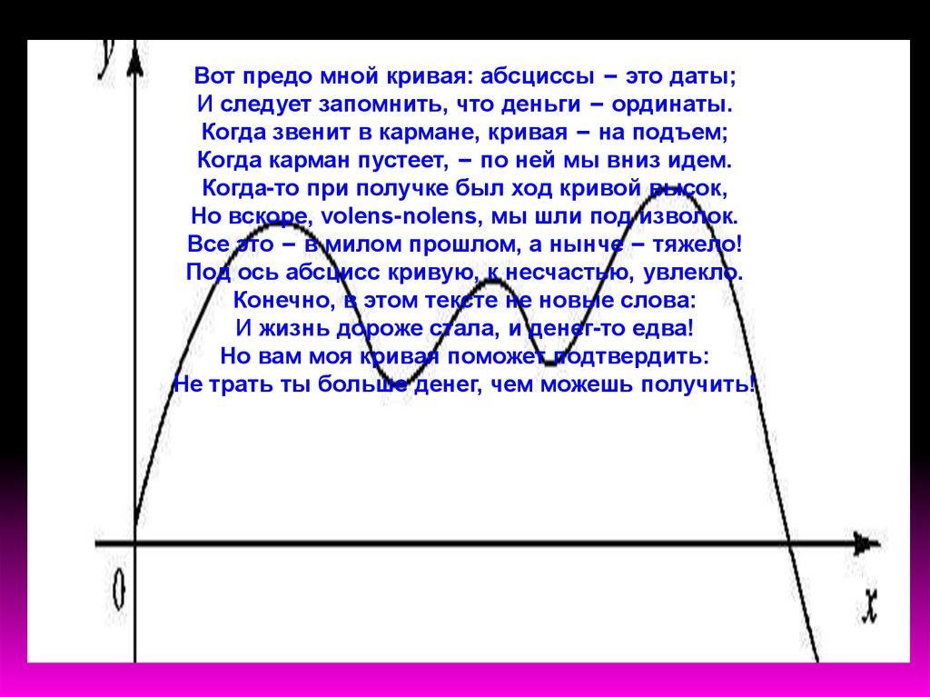 Вот предо мной кривая: абсциссы – это даты;И следует запомнить, что деньги – ординаты.
