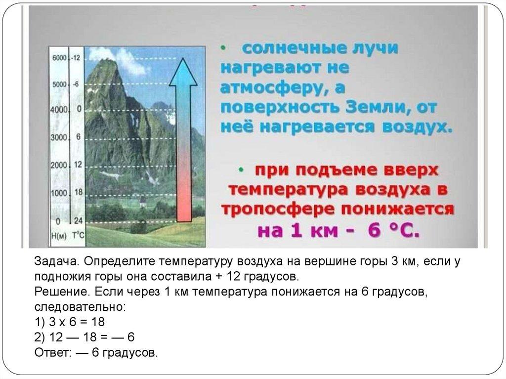 Задача. Определите температуру воздуха на вершине горы 3 км, если уподножия горы она составила + 12 градусов.