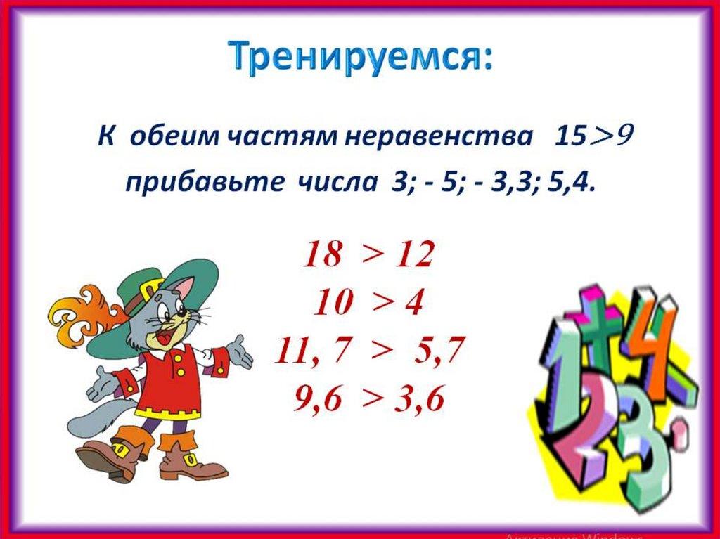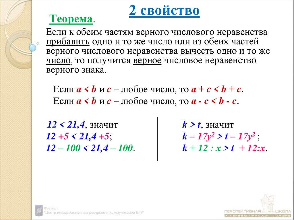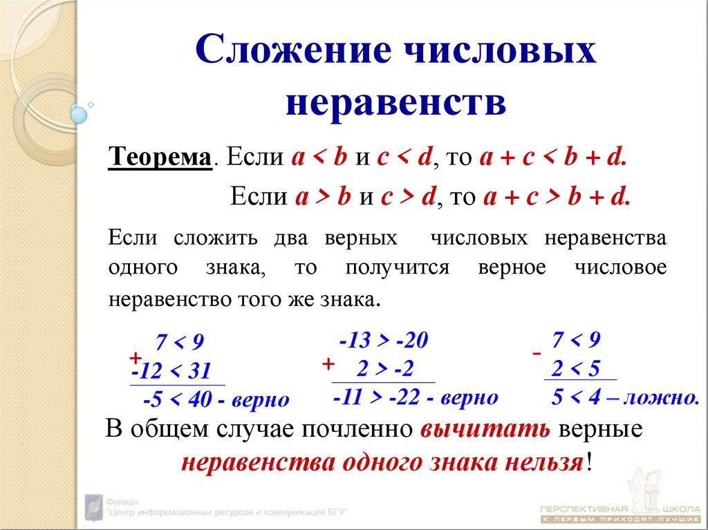 Теорема. Если а < b и с < d, то а + с < b + d.Если а > b и с > d, то а + с > b + d.