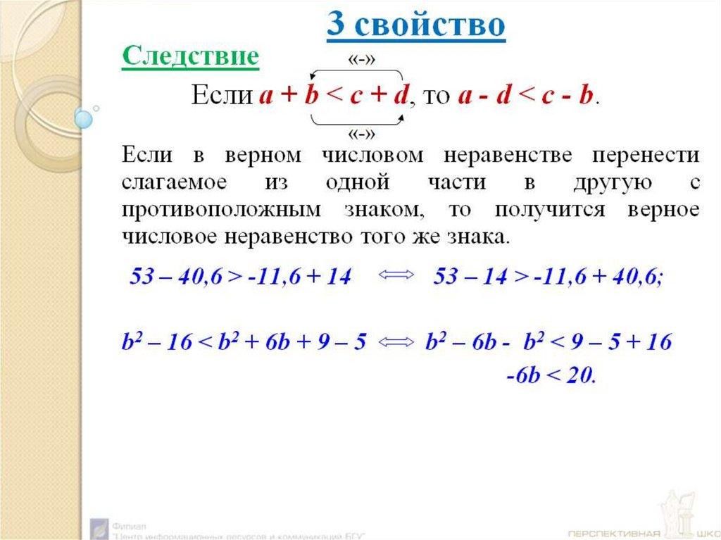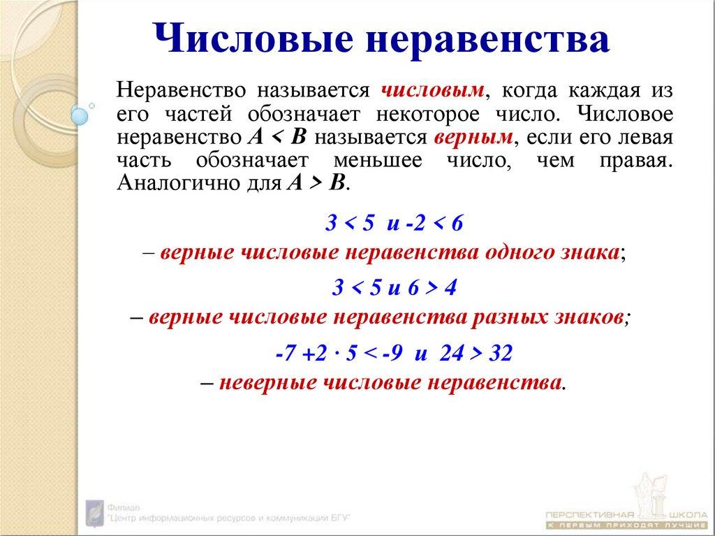 Неравенство называется числовым, когда каждая изего частей обозначает некоторое число. Числовое