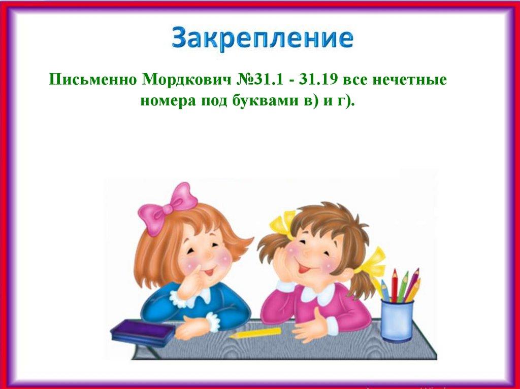 Письменно Мордкович №31.1 - 31.19 все нечетныеномера под буквами в) и г).