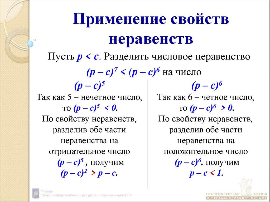 Пусть р < с. Разделить числовое неравенство(р – с)7 < (р – с)6 на число