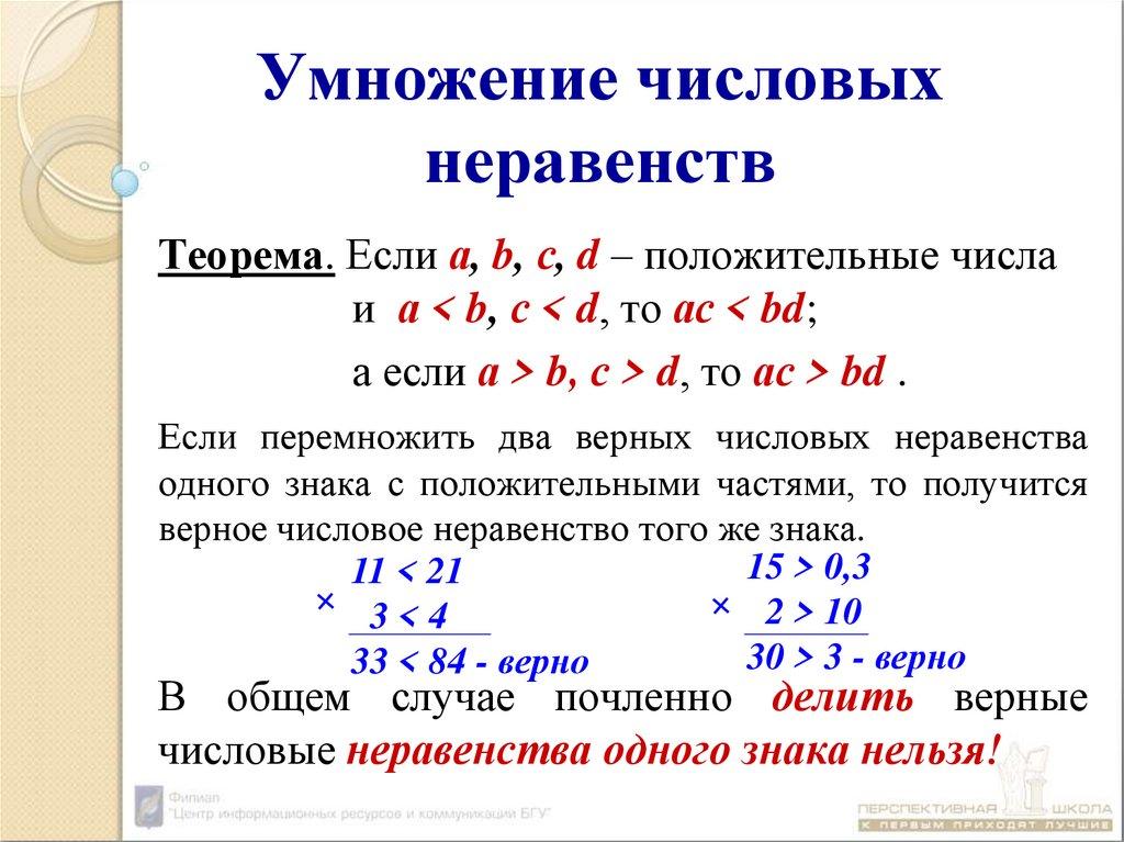 Теорема. Если а, b, с, d – положительные числаи а < b, с < d, то ас < bd;