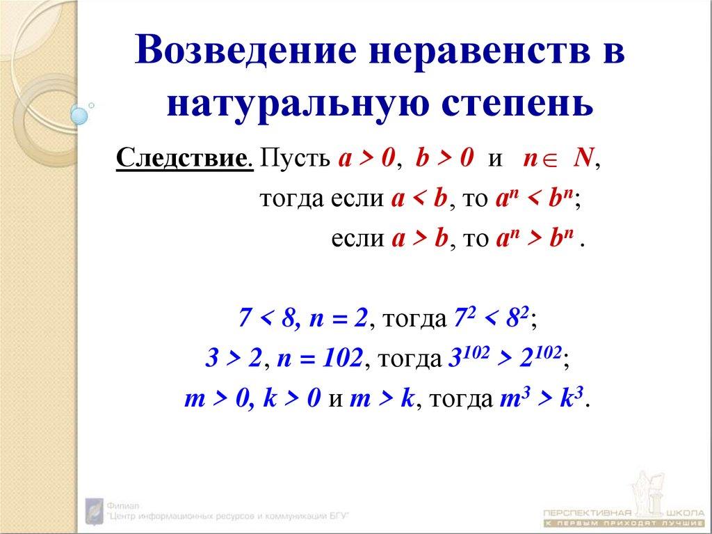 Следствие. Пусть а > 0, b > 0 и n N,тогда если а < b, то аn < bn;