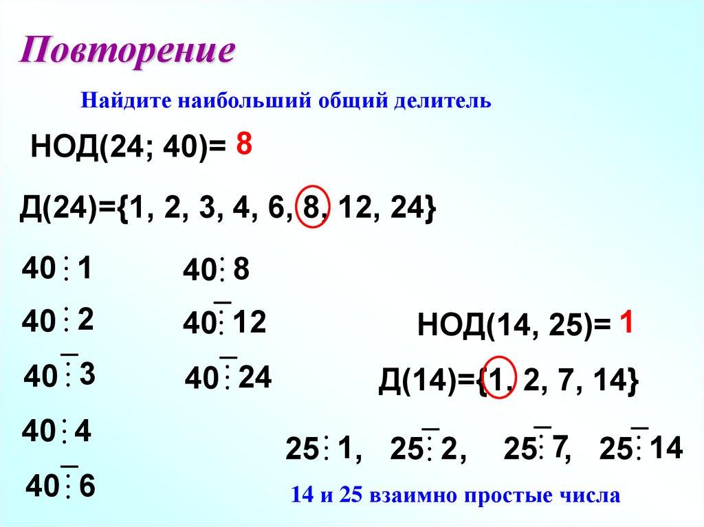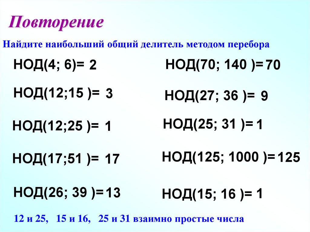 ПовторениеНайдите наибольший общий делитель методом перебора