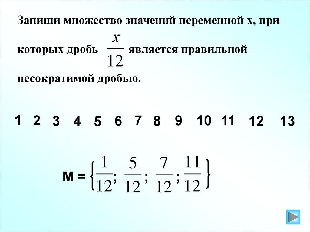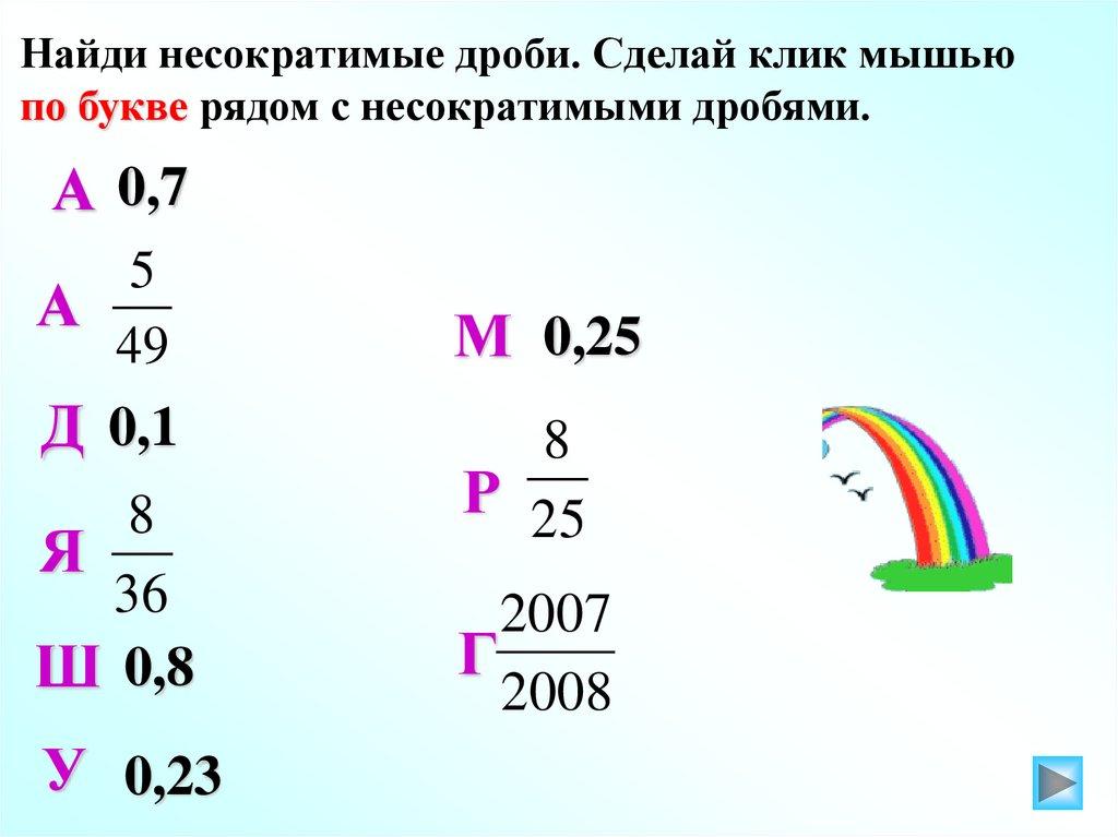 Найди несократимые дроби. Сделай клик мышьюпо букве рядом с несократимыми дробями.