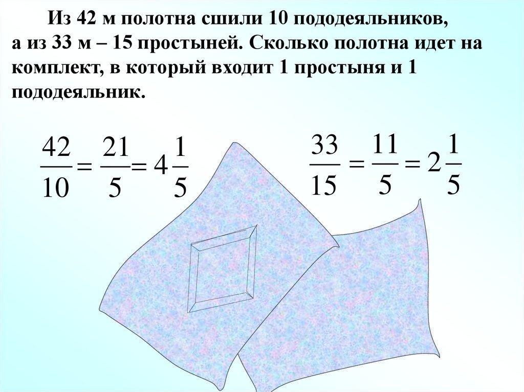 Из 42 м полотна сшили 10 пододеяльников,а из 33 м – 15 простыней. Сколько полотна идет на