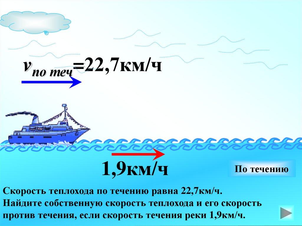 теплохода 22,4 км/ч, а скорость течения реки 1,7 км/ч.