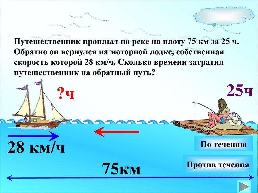 Путешественник проплыл по реке на плоту 75 км за 25 ч.Обратно он вернулся на моторной лодке, собственная