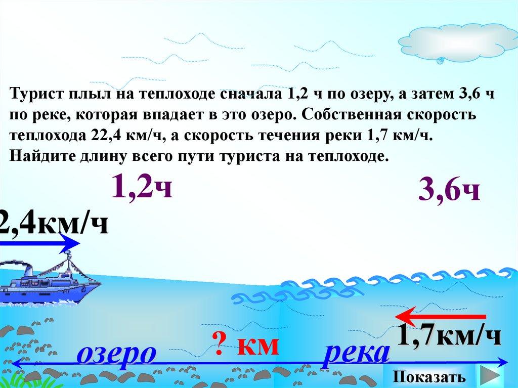 Турист плыл на теплоходе сначала 1,2 ч по озеру, а затем 3,6 чпо реке, которая впадает в это озеро. Собственная скорость