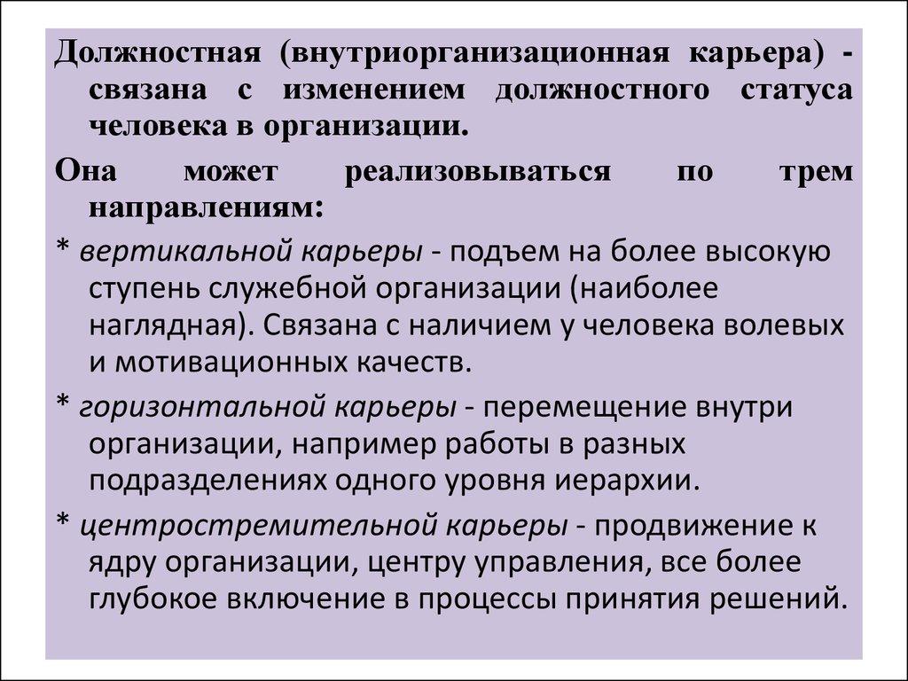 Должностная (внутриорганизационная карьера) связана с изменением должностного статусачеловека в организации.