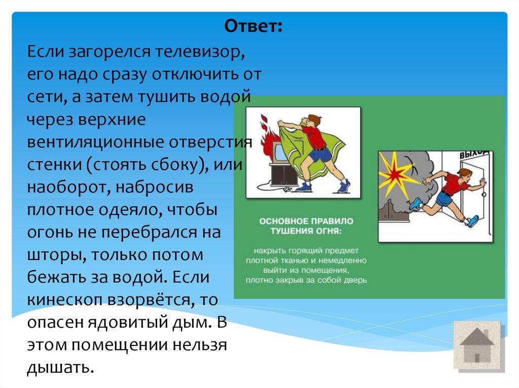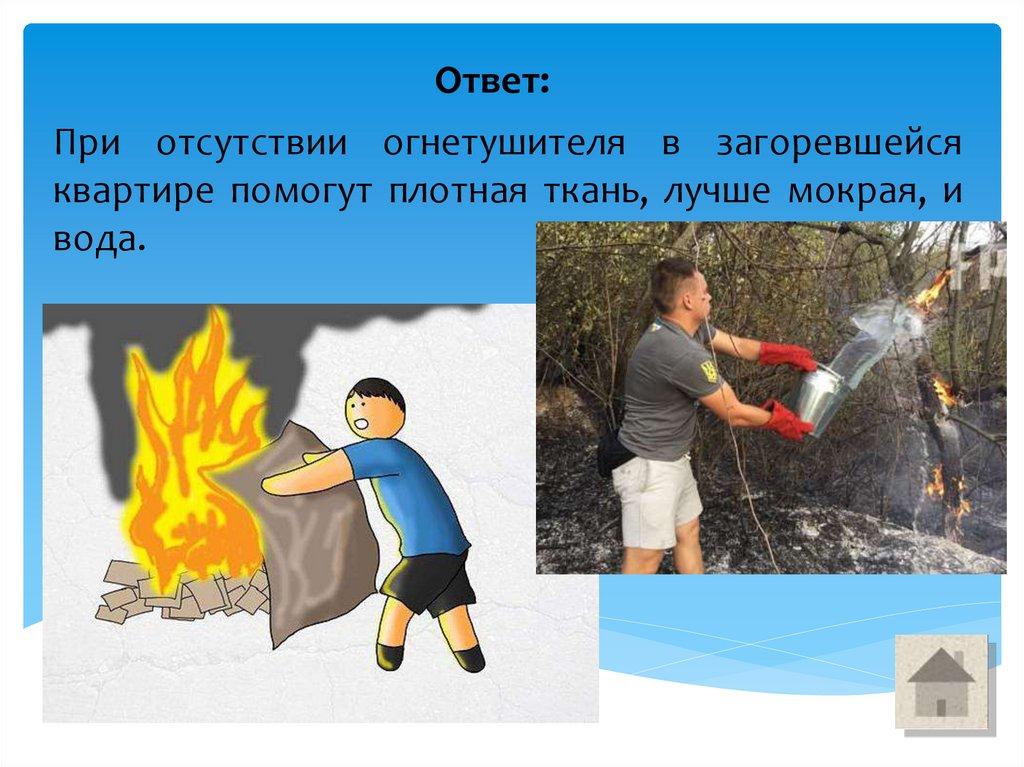 Ответ:При отсутствии огнетушителя в загоревшейся