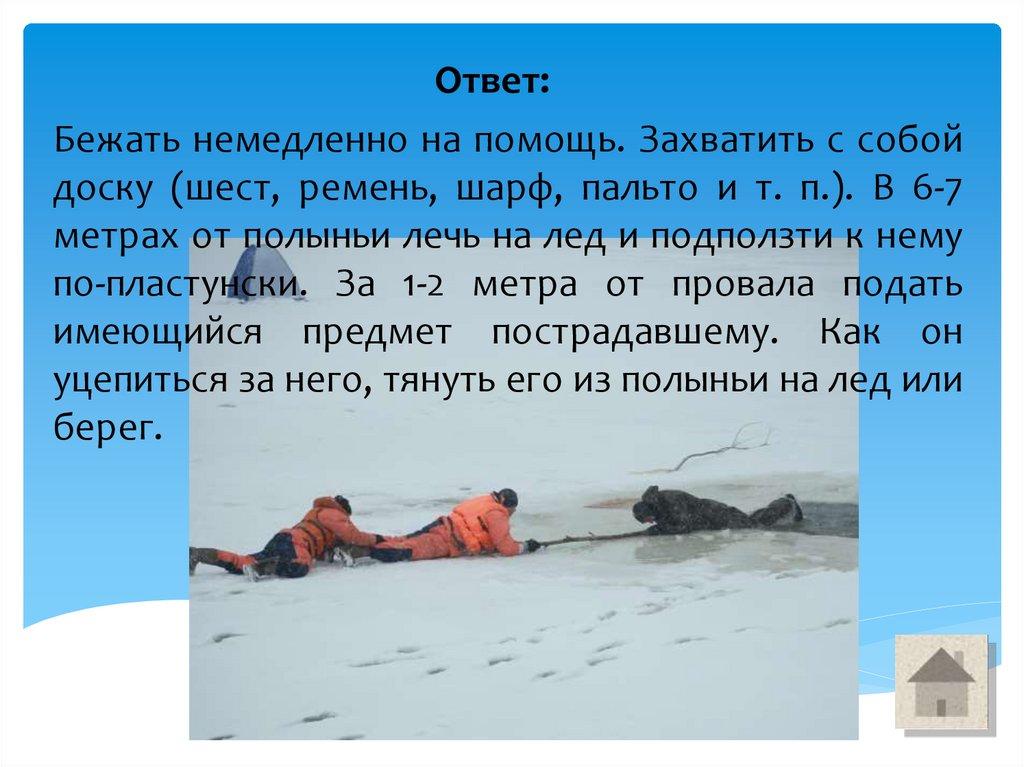Выбравшись, отползти по льду от опасного места