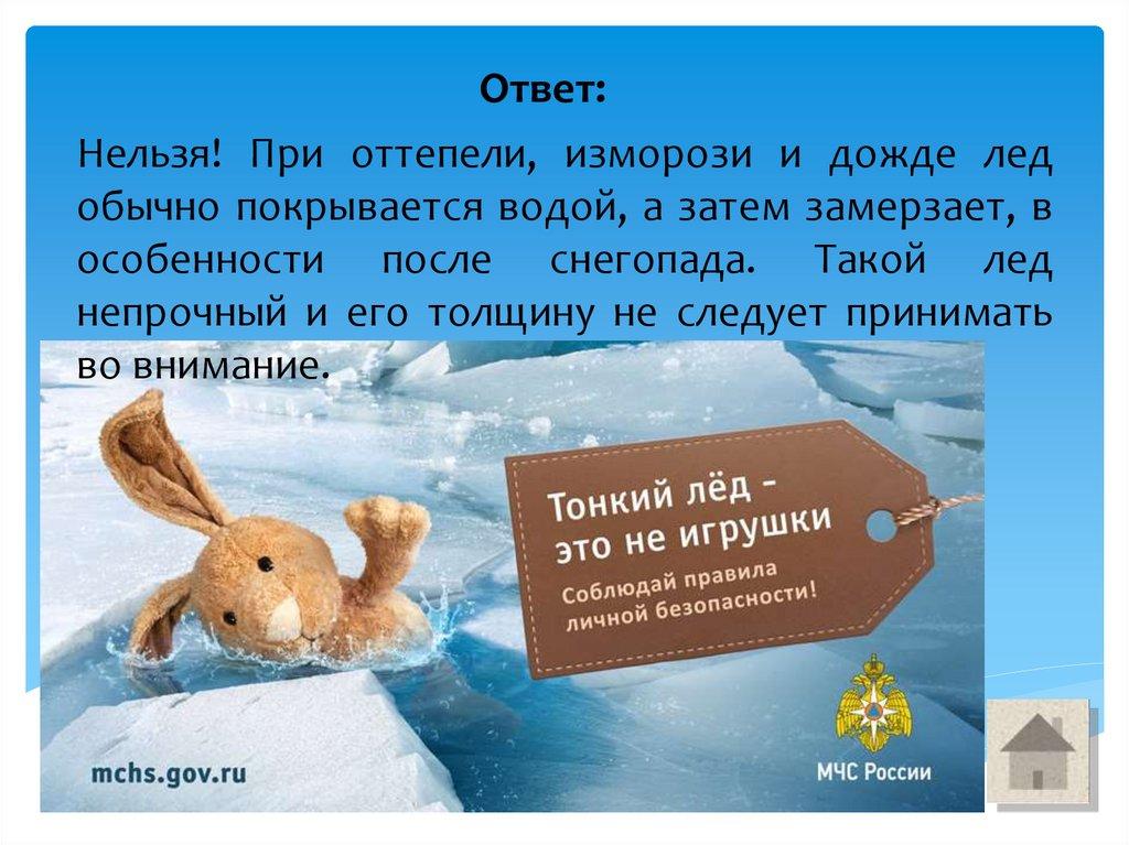 Ответ:Нельзя! При оттепели, изморози и дожде лед