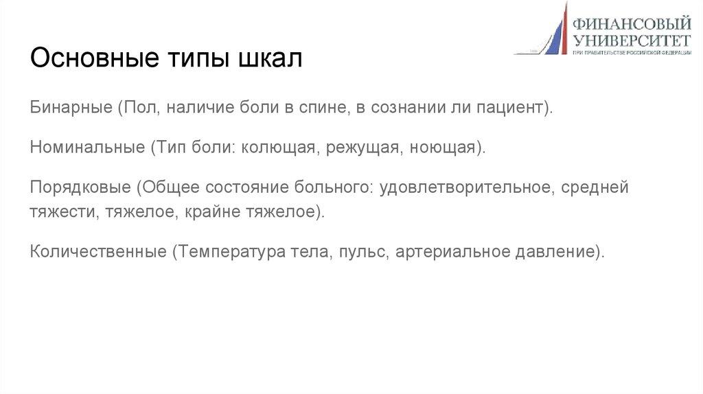 Основные типы шкалБинарные (Пол, наличие боли в спине, в сознании ли пациент).