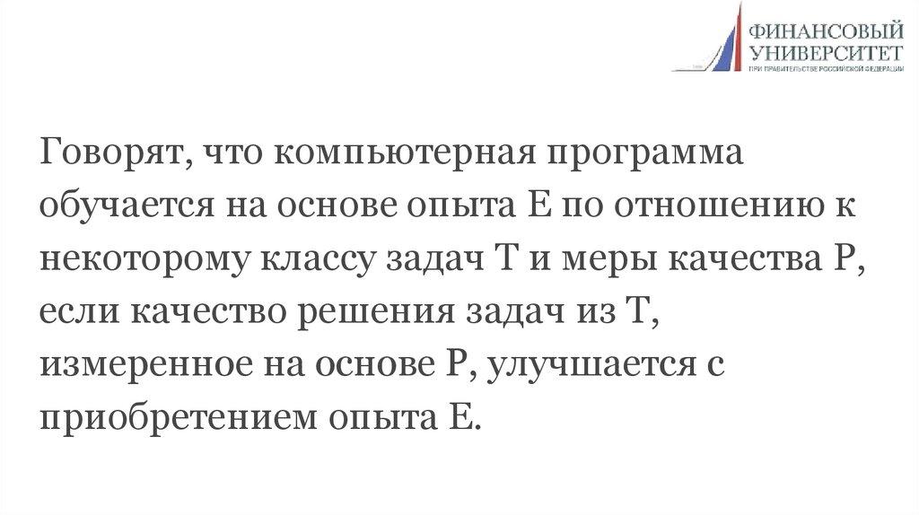 Говорят, что компьютерная программаобучается на основе опыта E по отношению к