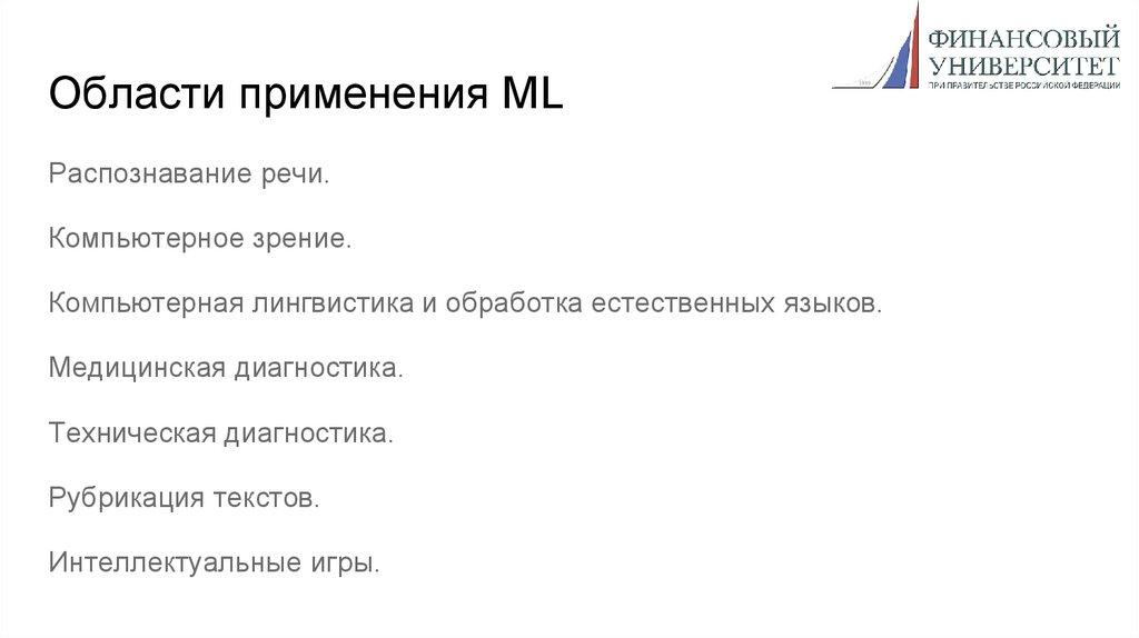 Области применения MLРаспознавание речи.