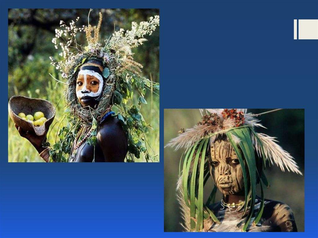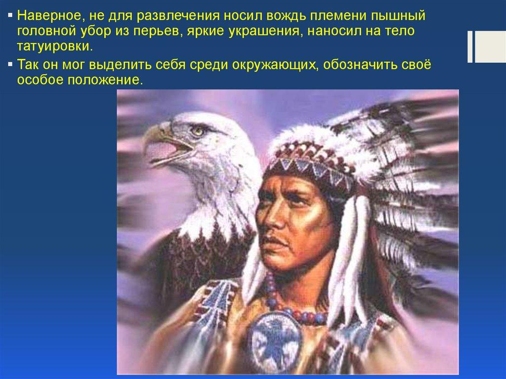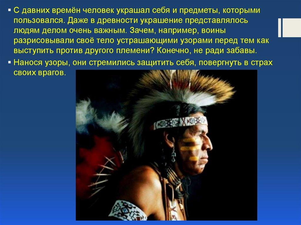 Наверное, не для развлечения носил вождь племени пышныйголовной убор из перьев, яркие украшения, наносил на тело