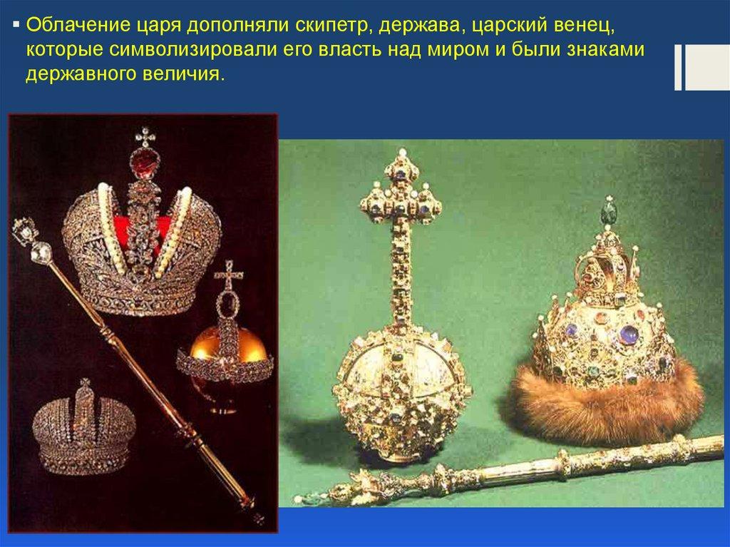 Облачение царя дополняли скипетр, держава, царский венец,которые символизировали его власть над миром и были знаками