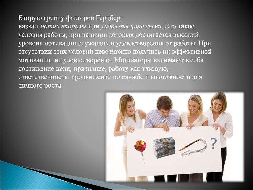 Вторую группу факторов Герцбергназвал мотиваторами или удовлетворителями. Это такие