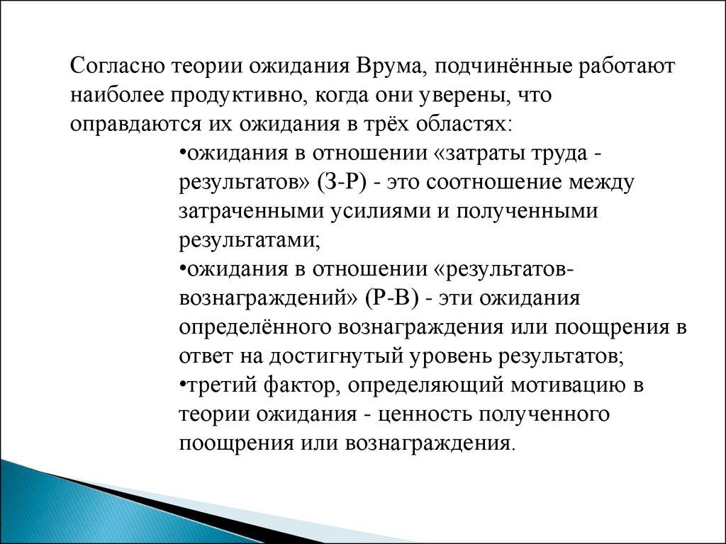 Согласно теории ожидания Врума, подчинённые работаютнаиболее продуктивно, когда они уверены, что