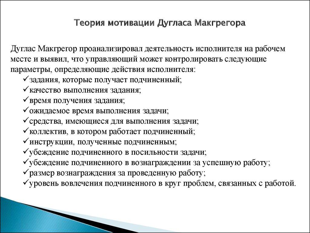 Теория мотивации Дугласа МакгрегораДуглас Макгрегор проанализировал деятельность исполнителя на рабочем